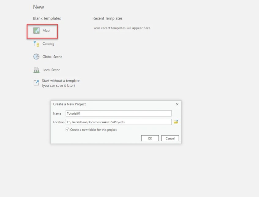 Enter the Name and Location for the new map project and then press OK. You can opt in the Create a new folder for this project if you want to automatically create the new project folder for your new project. This is great, because it will isolate your new project from any other existing projects. It will be easier to manage the projects in the future.