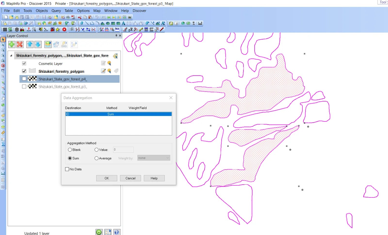 Specify the data aggregation. Since in this table, I don’t have any information, I can simply choose sum or Blank. Click OK and now your polygon should be combined into a single polygon.