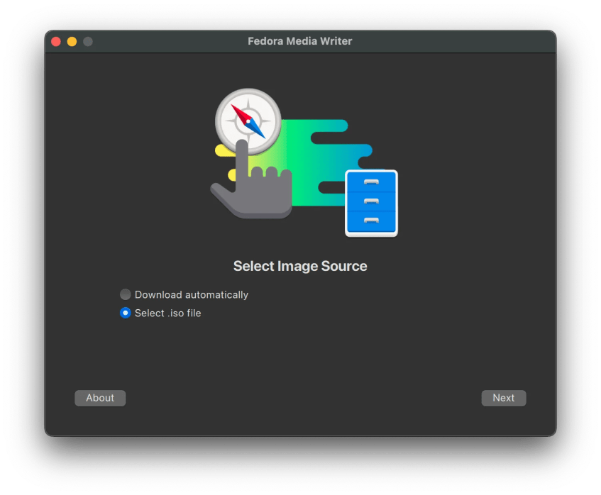 Open Fedora Media Writer, on the first page, select the image source. We can choose to download automatically (require internet connection) or select iso file.