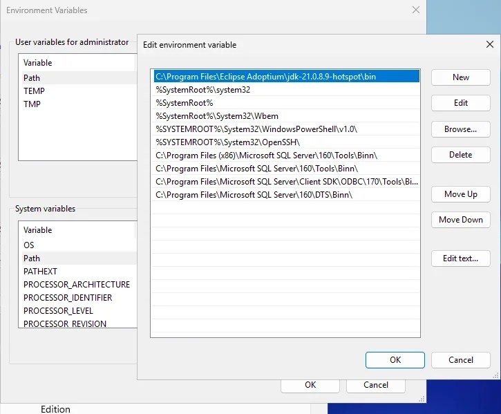 Still in the System Variable, click Path and create a new entry. Provide the bin directory of the Java.
