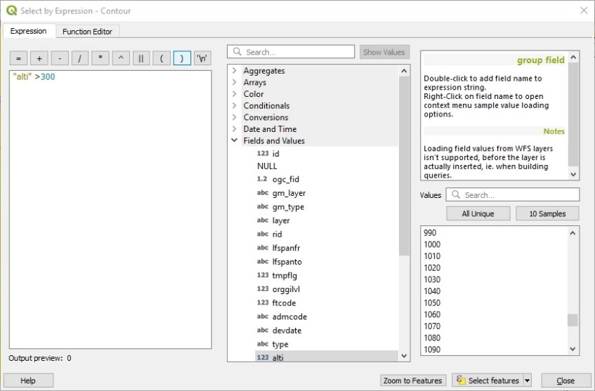 In the following example, I have a contour layer that contains thousands of line features that construct the contour. It has an “Alti” column which contains altitude information. For example, I want to select the contour lines which have an altitude of more than 300 meters.